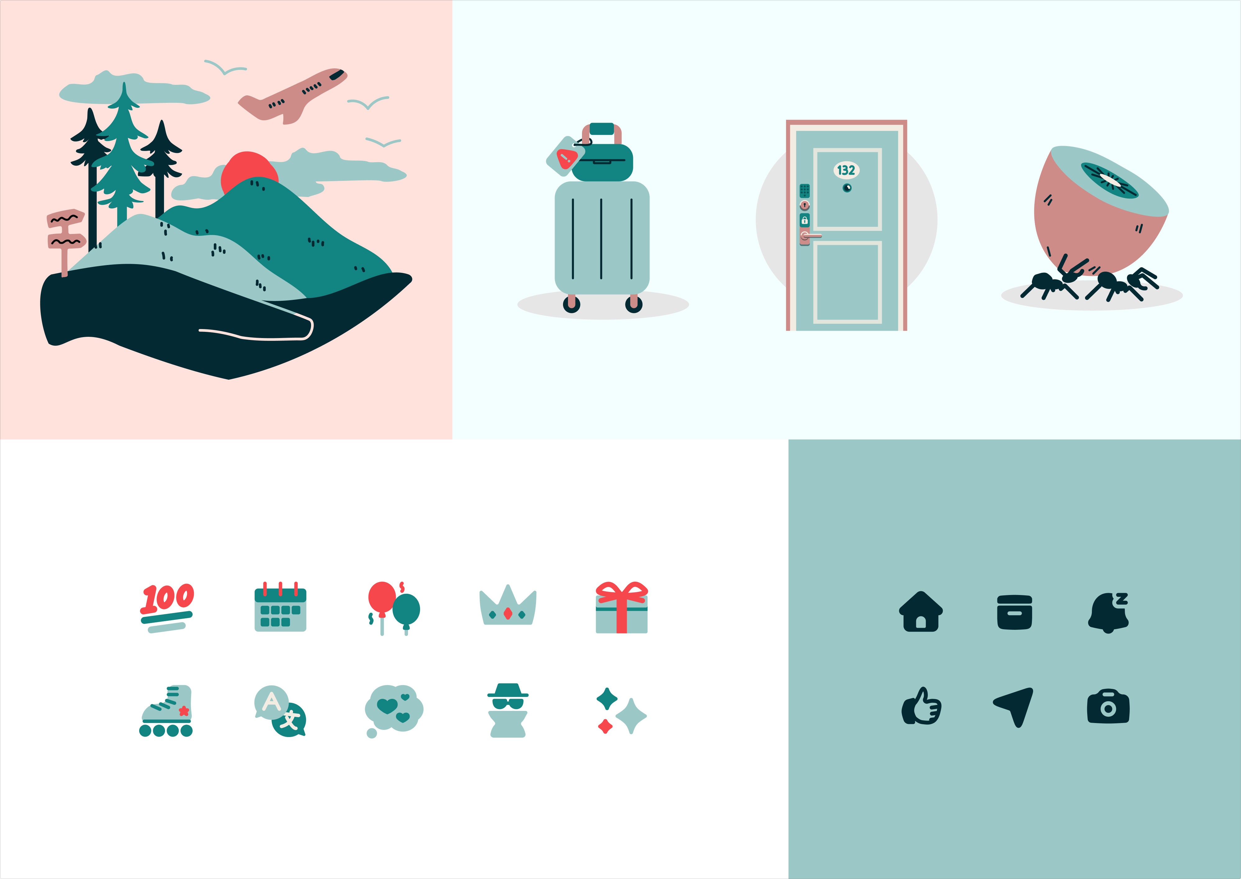A cohesive illustration system for Pomegranate Travel, a modern travel app brand.